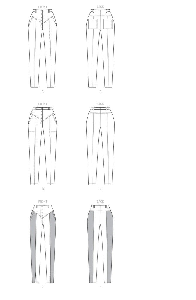 Narrow leg, front and back yokes, button front and side front pocket, A: back patch pockets, C: contrast sides.